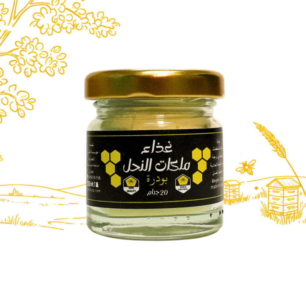 نقدم لك غذاء ملكات النحل الأصلي البودرة النقية بوزن 20 جرام. هذه البودرة هي الشكل الأمثل لضمان وصول المكونات النشطة إليك بكامل فاعليتها، وتُعد من أقوى المكملات الطبيعية لزيادة الحيوية والنشاط. ابدأ استثمارك الرابح في صحتك مع أفضل نوع غذاء ملكات النحل